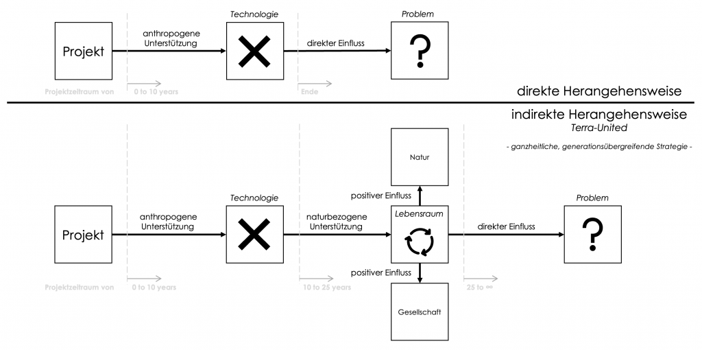 Projekte, mit undefinierten Ende sind in unserer klassischer Betrachtung unmöglich zu planen. Eine Lösung dafür ist die indirekte Betrachtung auf das eigentliche Umweltproblem. So findet sich bei der Strategie von Terra-United die Lösung in einem sich selbst versorgenden Kreislaufsystem, dass durch die Gesellschaft erschaffen und bewirtschaftet wird. Der direkte Einfluss des erschaffenen Lebensraums bewirkt eine Stabilisierung auf die anhaltende Veränderung des gesamten Umweltsystems. So kann sichergestellt werden, dass die Unterstützungsleistung für das System jederzeit aufrecht erhalten bleibt.