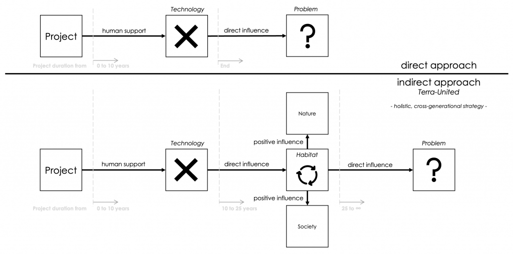 In view of the increasing need for action, especially for environmental protection and nature conservation, our society is called upon to meet the growing demands. Project-related measures correspond to our standardized possibilities and represent a plannable prerequisite. However, these social procedures reach their limits when viewed over the longer term and usually leave more open questions. Starting a project on the topic of environmental protection must therefore begin with the premise that the reaction to be supported never ends. This is the only way to guarantee that the healing process in the environment is sustainable and long-term. Projects with an undefined end are impossible to plan in our classical view. One solution to this is to look indirectly at the actual environmental problem. In Terra United’s strategy, the solution is found in a self-sustaining cycle that is created and managed by society. The direct influence of the created habitat has a stabilizing effect on the ongoing change of the entire environmental system. This ensures that the support for the system is maintained at all times.